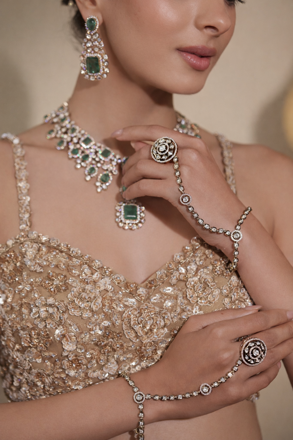 A story woven in sparkle and symmetry, the Afsana Hathphool is designed to command attention with effortless grace. Featuring an intricate circular motif linked with a delicate stone-studded hand chain, this piece beautifully frames the hand while adding a regal glow to every gesture. Whether styled for bridal celebrations, festive soirées, or statement occasions, Afsana brings timeless charm with a contemporary finish.
