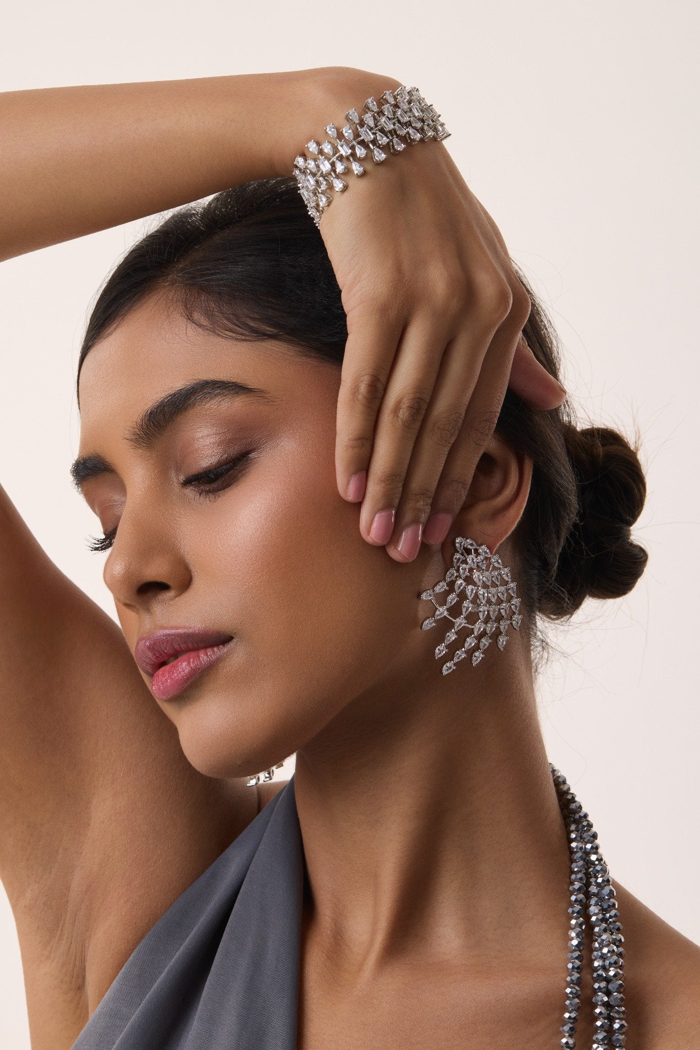 Elegant and radiant, the Celeste Cascade Bracelet is designed to mimic the graceful flow of cascading light. Featuring multiple rows of delicately set crystals arranged in a refined lattice pattern, this bracelet sparkles beautifully with every movement. Its sleek and modern silhouette adds a touch of sophistication, making it perfect for evening occasions, celebrations, or elevating a contemporary look. The Celeste Cascade Bracelet effortlessly combines glamour with timeless elegance, making it a standout addition to any jewellery collection.