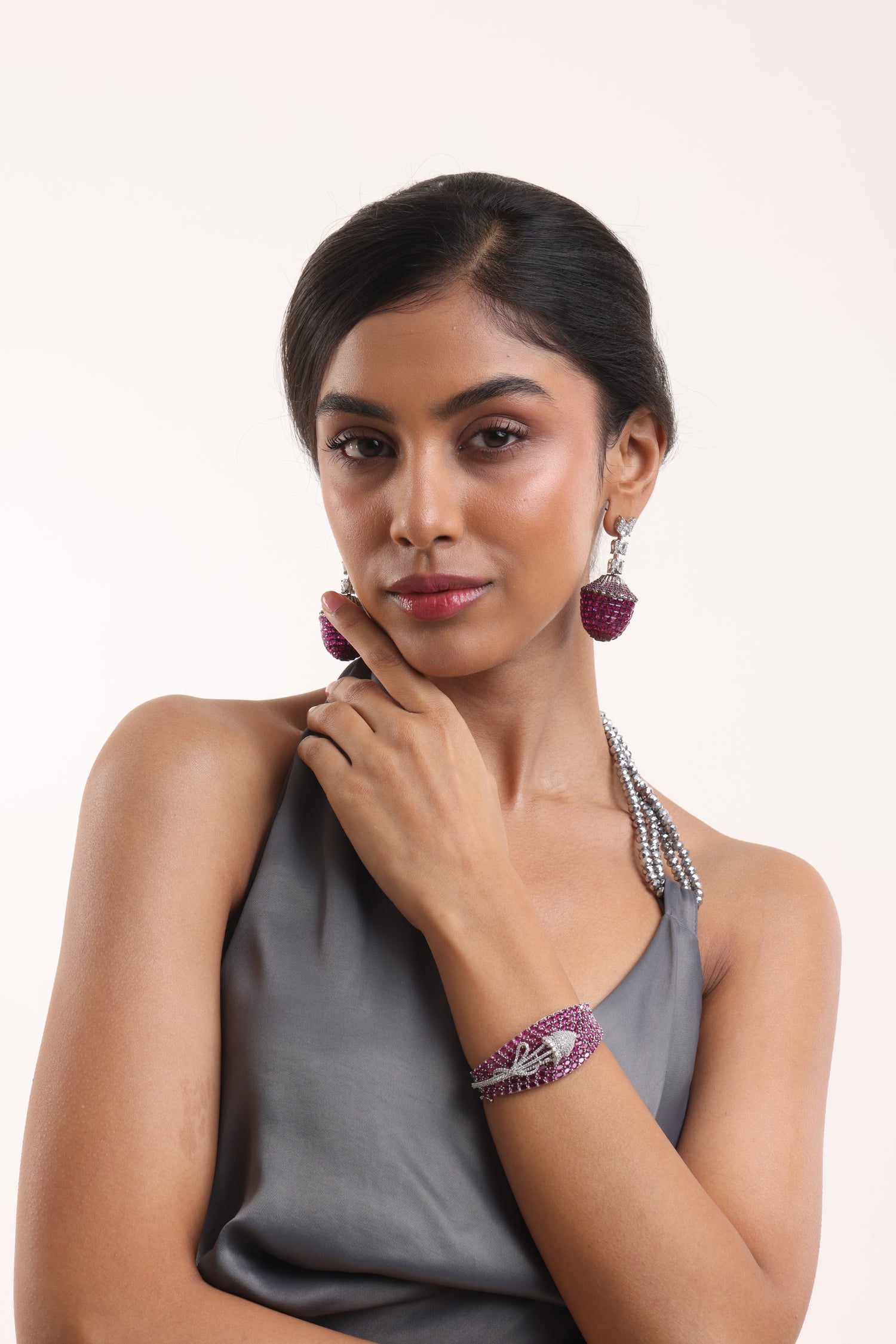 Luna Drop is a refined statement earring that balances softness with brilliance. Featuring a sculpted drop silhouette encrusted with deep ruby-toned stones and finished with delicate crystal accents, it captures light with every movement. Elegant yet understated, Luna Drop is designed to elevate evening wear, cocktail looks, and modern festive styling without overpowering the ensemble.