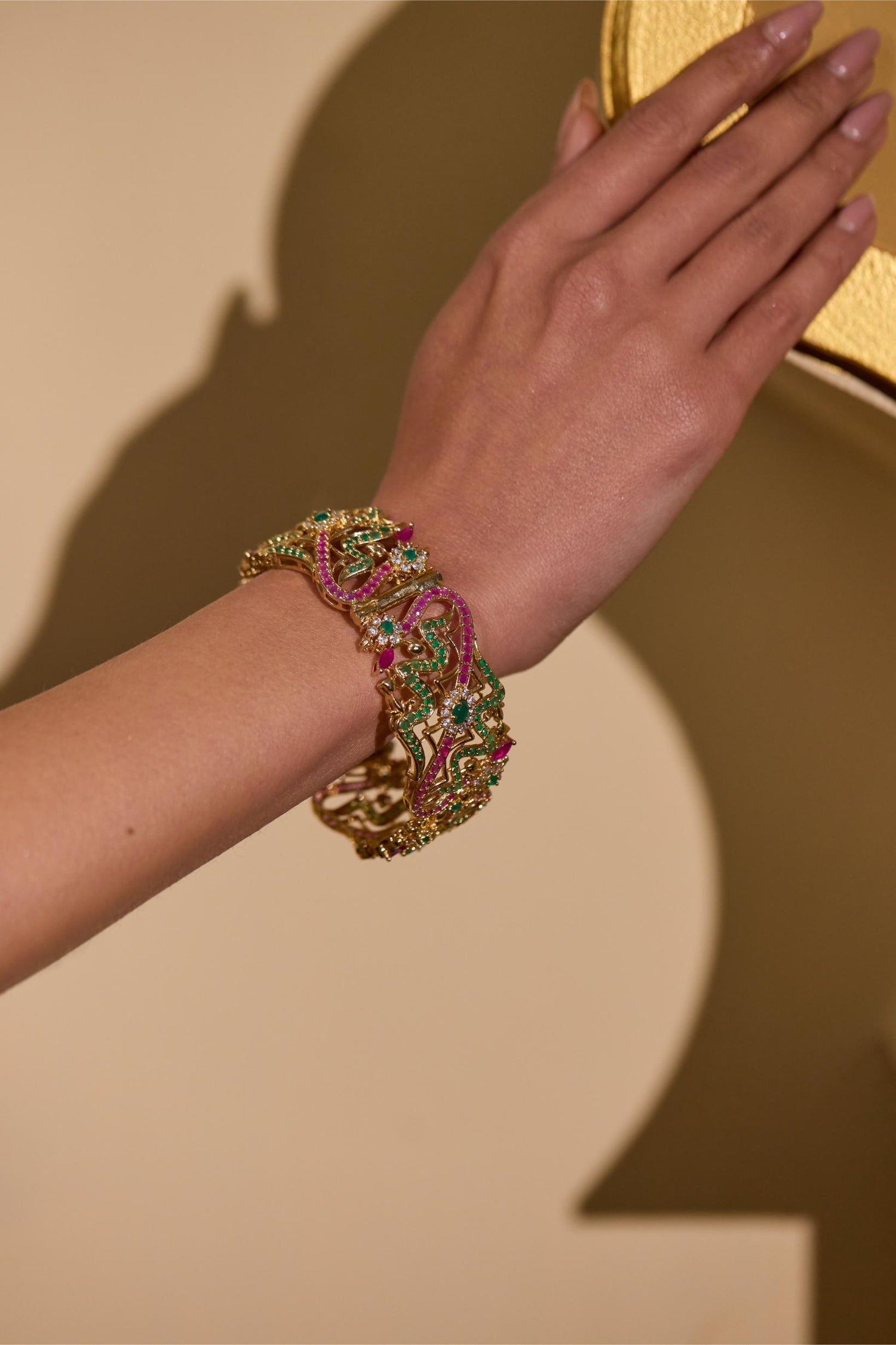 An ode to regal grandeur, the Maharani Zoya Kada is designed for the bride who embraces heritage with confidence and grace. Crafted in an intricate openwork silhouette, this statement bangle features deep onyx accents that add richness and contrast to its luminous gold finish. The bold curves and detailed craftsmanship echo royal court jewelry, while the structured form ensures a powerful, elegant presence on the wrist.