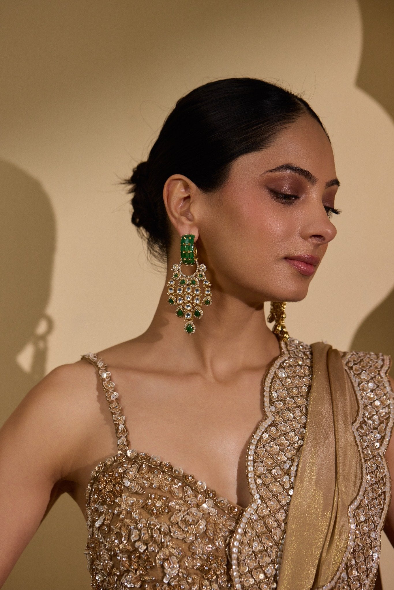 The sculpted design cascades elegantly, making it the perfect statement for bridal ensembles, festive occasions, and heirloom-inspired styling. These earrings don’t just complement an outfit — they command it.