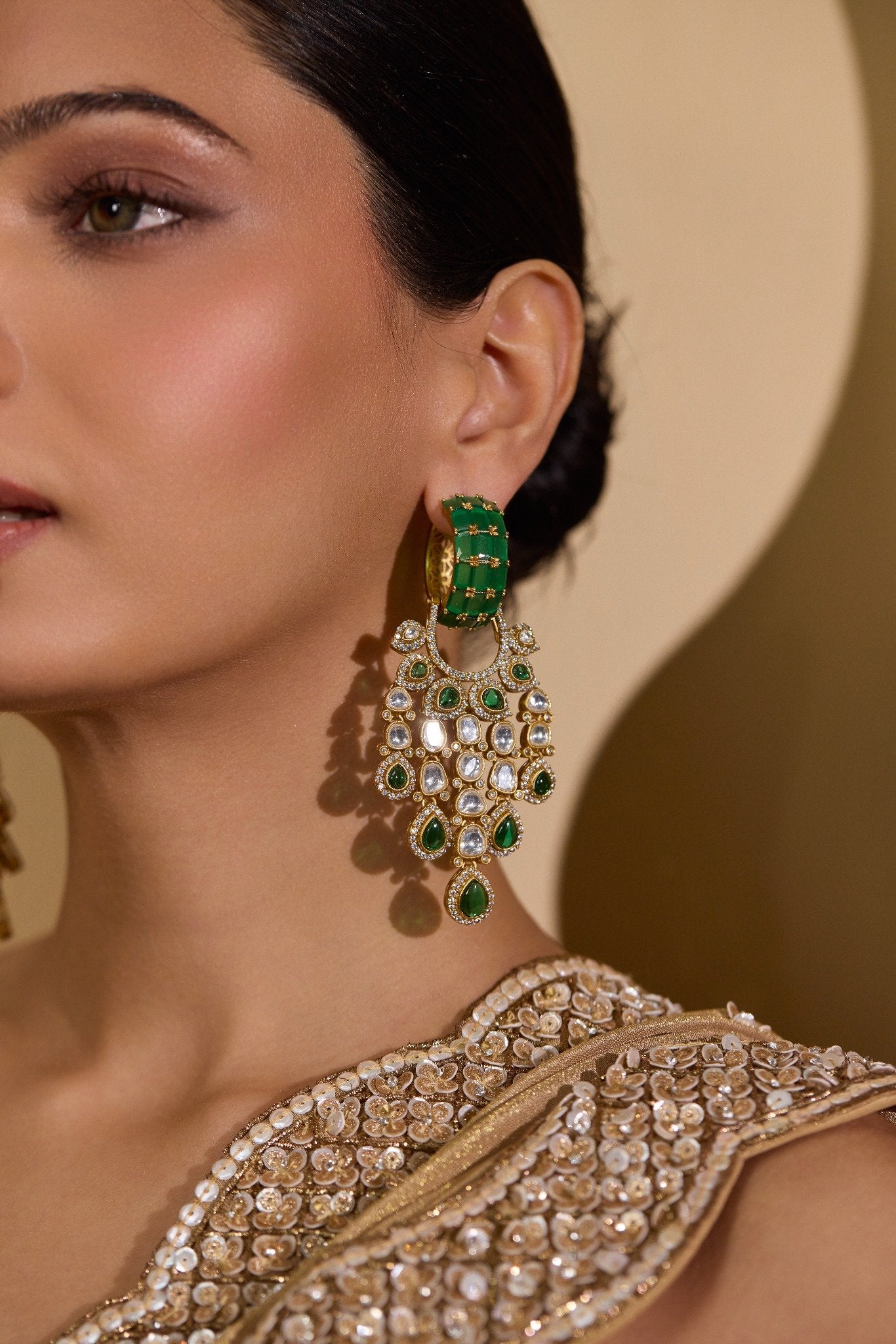 Inspired by the opulence of Mughal royalty, Noor Jahan Verde is a striking celebration of heritage craftsmanship. Deep green onyx stones create a rich, regal contrast against the brilliance of hand-set silver foiled kundan, forming a silhouette that feels both powerful and graceful.