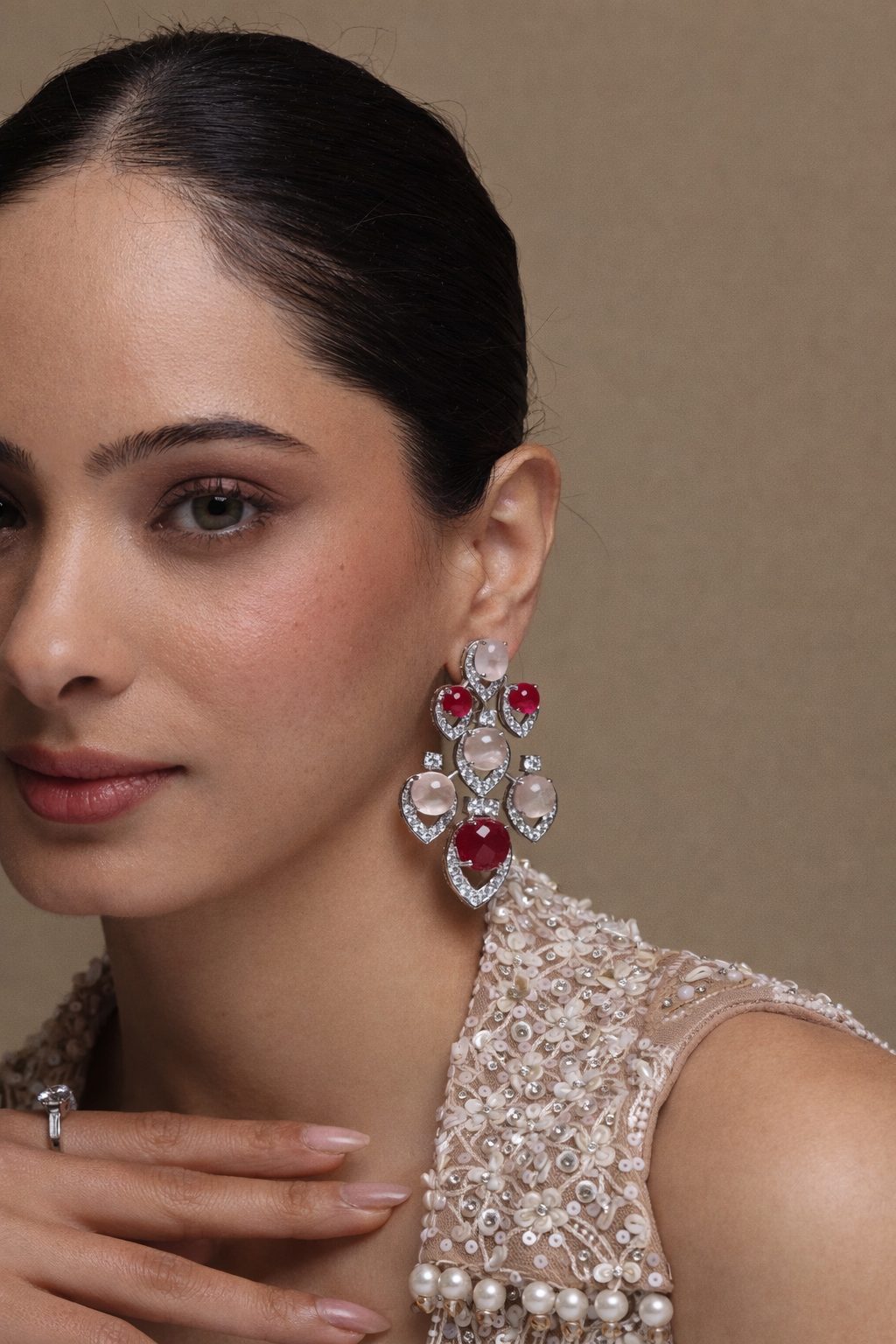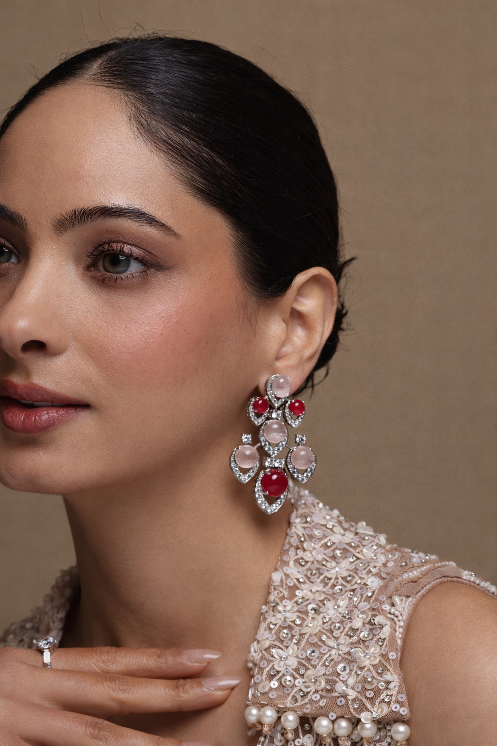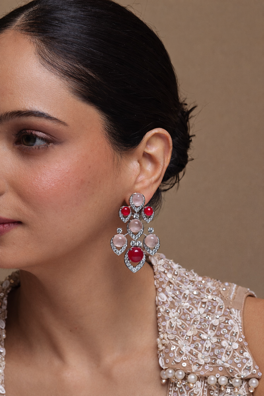 A luminous harmony of passion and poise, the Noor Roselle Chandeliers are designed to glow with understated opulence. Set in hallmarked 92.5 silver, these statement earrings bring together the deep crimson allure of Red Spinel and the soft blush serenity of Rose Quartz—a pairing that feels both regal and romantic. Sculpted in a graceful chandelier silhouette, they catch the light beautifully, making them perfect for festive celebrations and elevated everyday elegance.