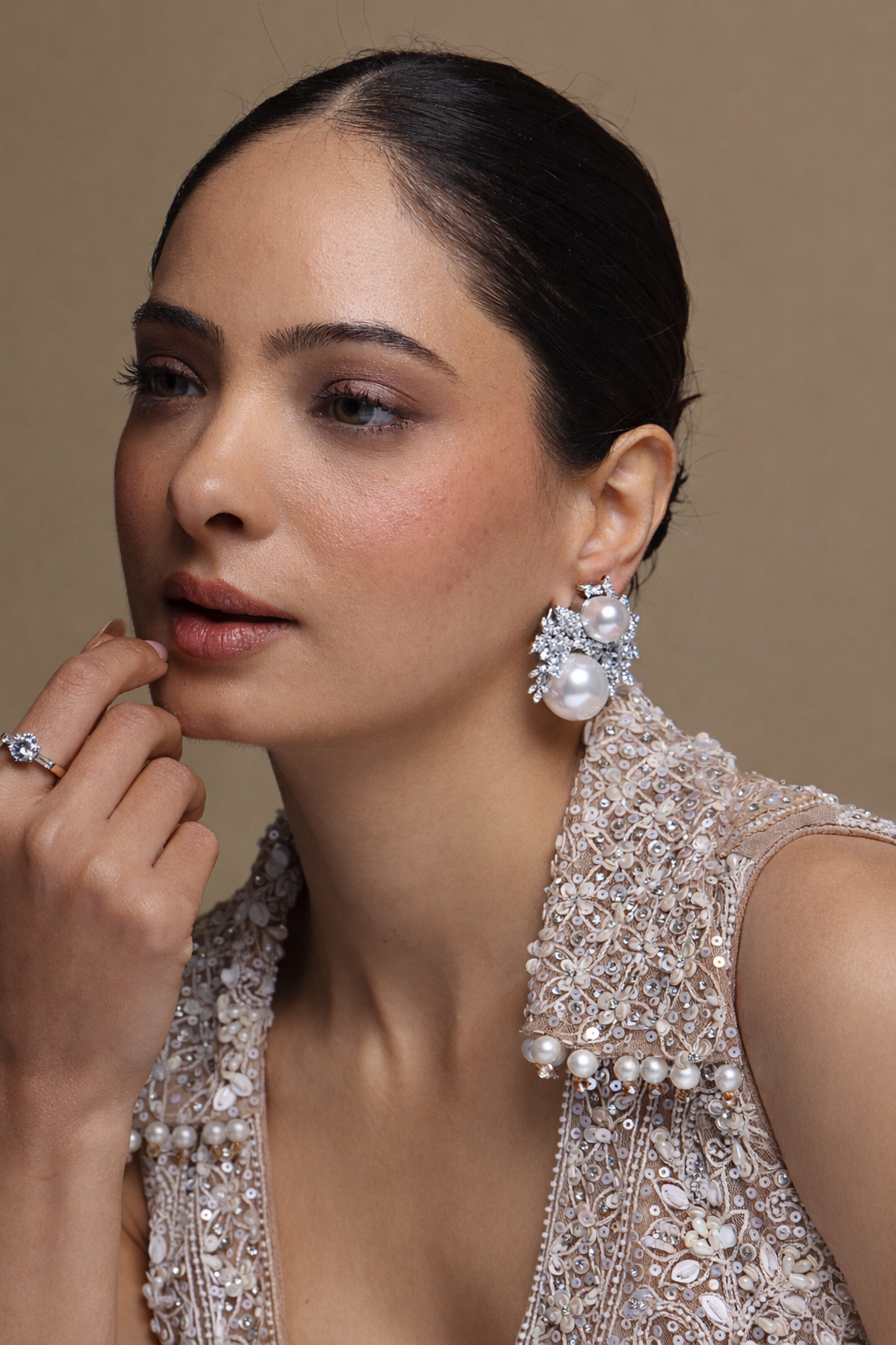 A graceful interplay of shimmer and softness, the Pearl Reverie Studs feature luminous shell pearls embraced by a delicate halo of sparkling accents. Designed to evoke timeless romance with a modern sensibility, these studs add an effortless touch of elegance—perfect for bridal moments, evening soirées, or elevating everyday looks.