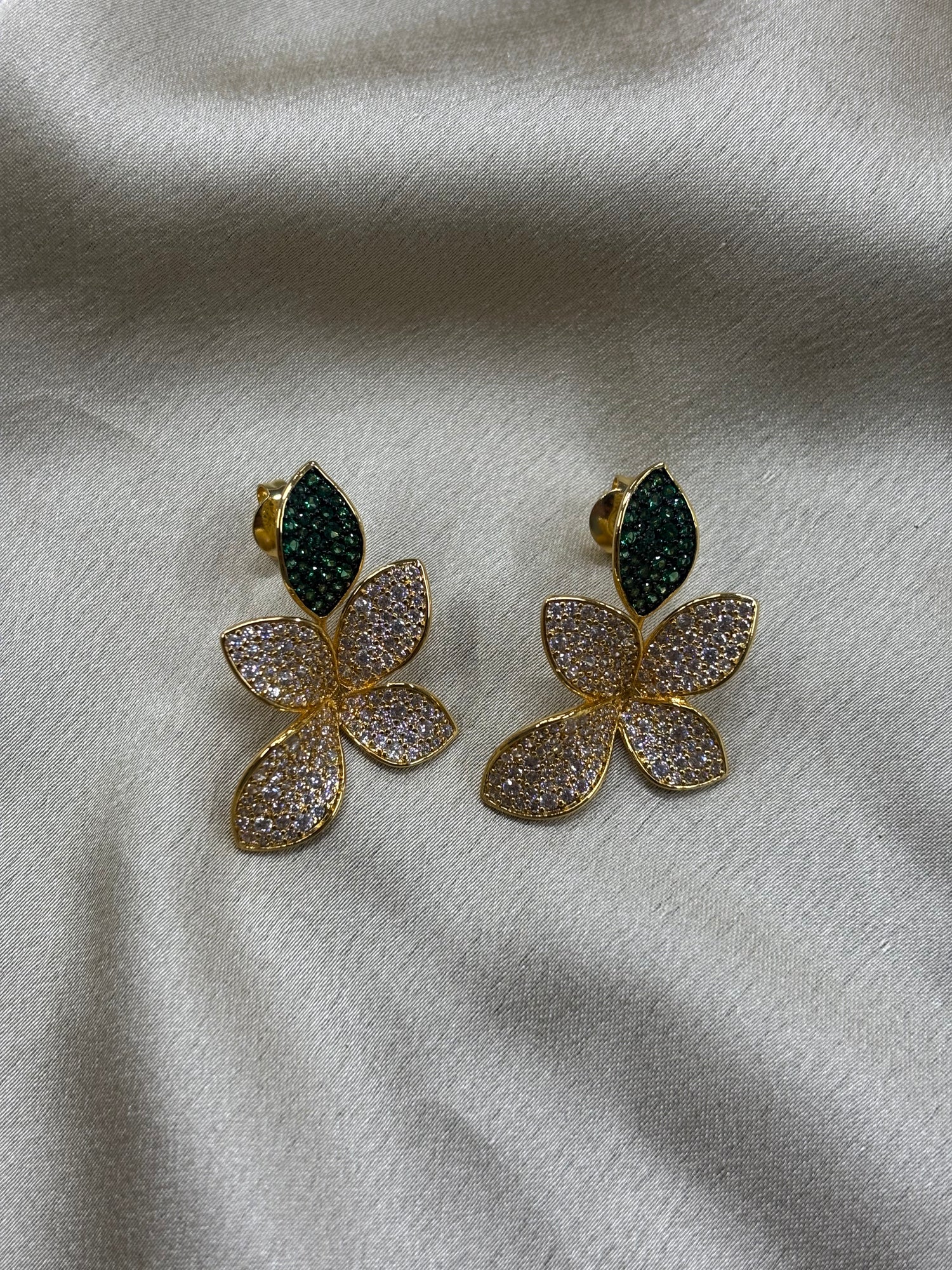 Delicate and enchanting, the Emerald Petal Earrings bring nature’s elegance to life. Shaped like blooming petals and adorned with radiant emerald-green stones, these earrings are a graceful blend of floral beauty and timeless glamour. The gold-tone setting adds warmth and luxury, making them a standout accessory for any occasion.